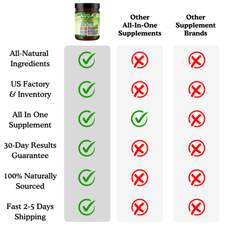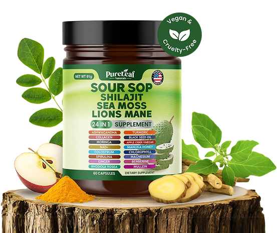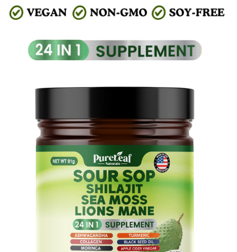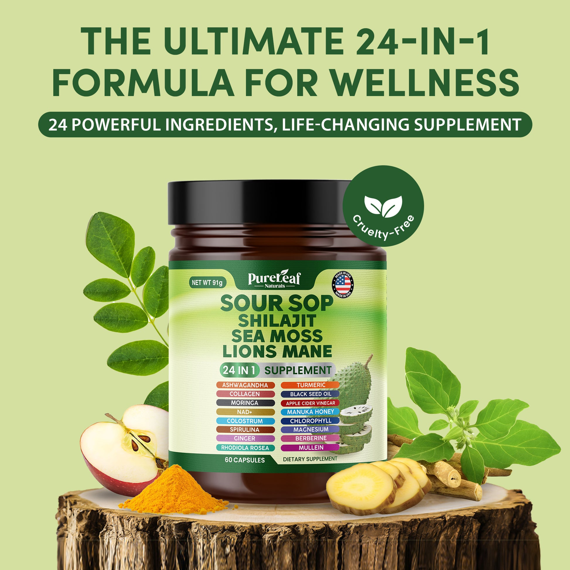 PureLeaf™ - 24 in 1 Supplement is a comprehensive health supplement designed to support various aspects of your well-being. It combines 24 potent ingredients, including Irish Sea Moss, Black Seed, Ashwagandha, and more, to enhance your immune system, improve gut health, and provide steady energy.